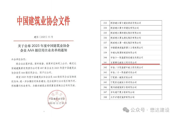 12月25日,中國(guó)建筑業(yè)協(xié)會(huì)公布了2025年度建筑業(yè)AAA級(jí)信用企業(yè)評(píng)審結(jié)果,甘肅懋達(dá)建設(shè)工程有限公司榮獲“2025年度建筑業(yè)AAA級(jí)信用企業(yè)”榮譽(yù)稱號(hào)。這是自2022年首次獲評(píng)后,公司再次獲評(píng)該稱號(hào)。這一殊榮的取得,不僅是對(duì)公司長(zhǎng)期以來(lái)誠(chéng)信經(jīng)營(yíng)、穩(wěn)健發(fā)展的高度認(rèn)可,也是公司綜合實(shí)力和品牌影響力的重要體現(xiàn)。